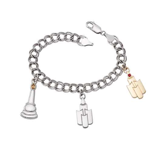 Custom gold and silver PartyLite recognition charms line this sterling silver double link bracelet with lobster claw clasp. These charms are part of PartyLite's consultant recognition program.