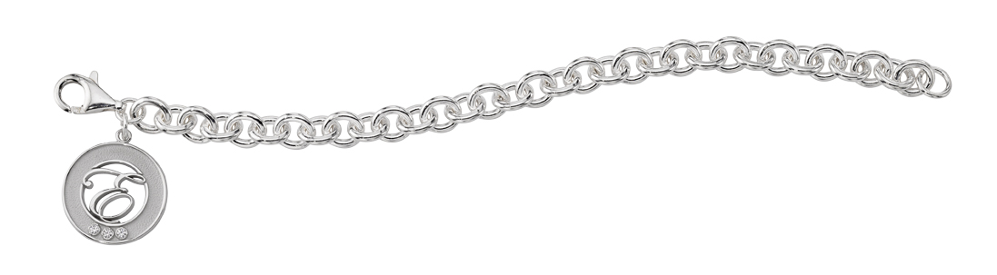 Three diamonds line the circular bottom of this custom sandblast and polished silver charm recognizing Elite Circle status of Tupperware consultants.