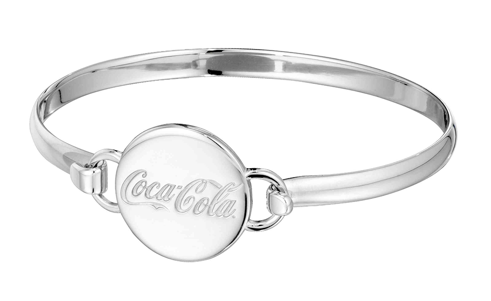 The Coca-Cola logo adorns this sterling silver interchangeable clasp bangle bracelet. The logoed clasp can be removed and replaced with other custom clasps for unlimited styles and designs.