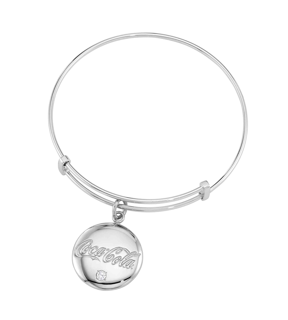This silver adjustable bangle bracelet features a custom silver sandblast and polished Coca-Cola logoed charm adorned with a stone set diamond.