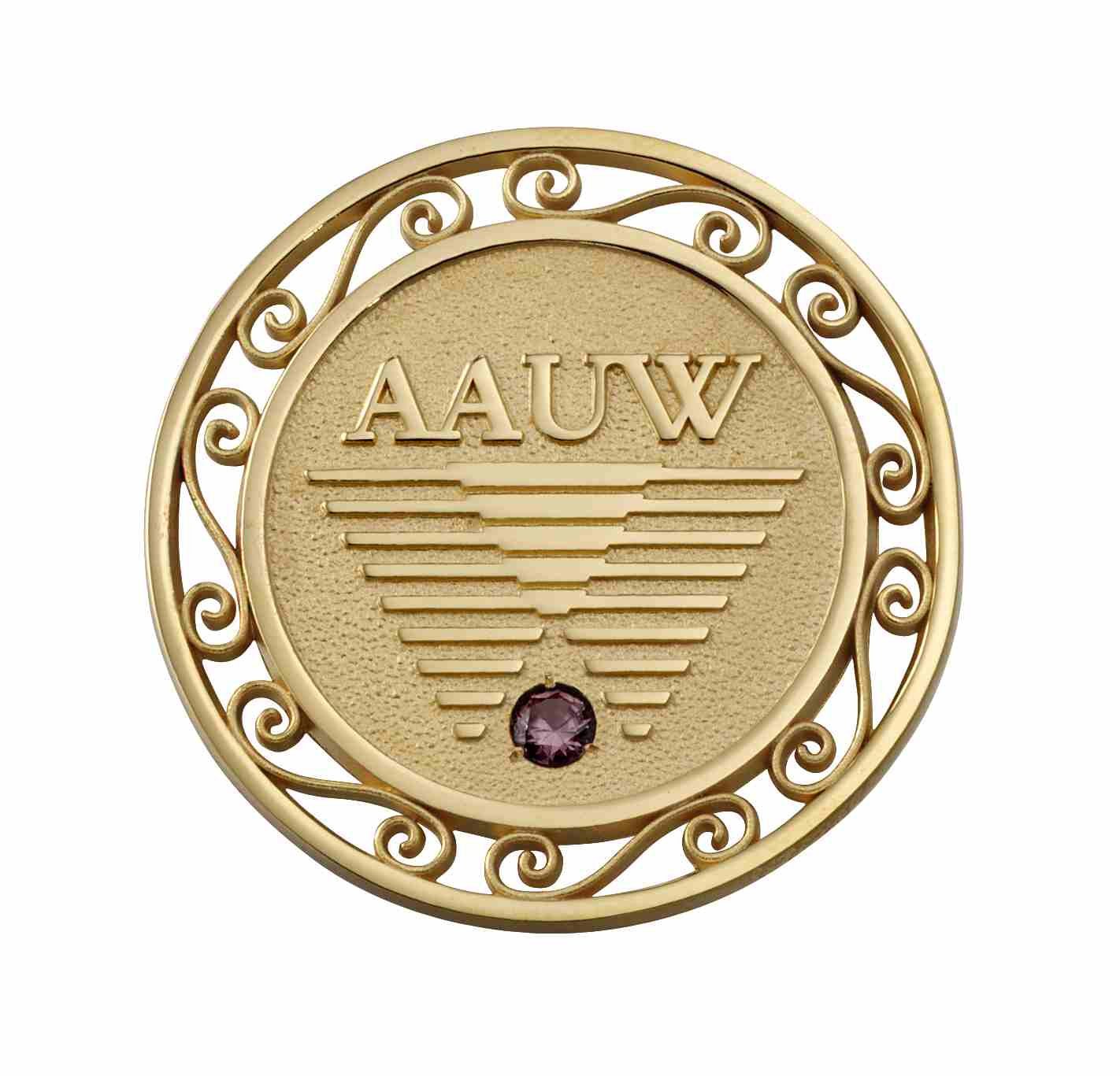 The filigree scrollwork adds an elegant dimension to this custom gold sandblast and polished brooch pin. The AAUW uses different stones in the piece to indicate years of service levels.