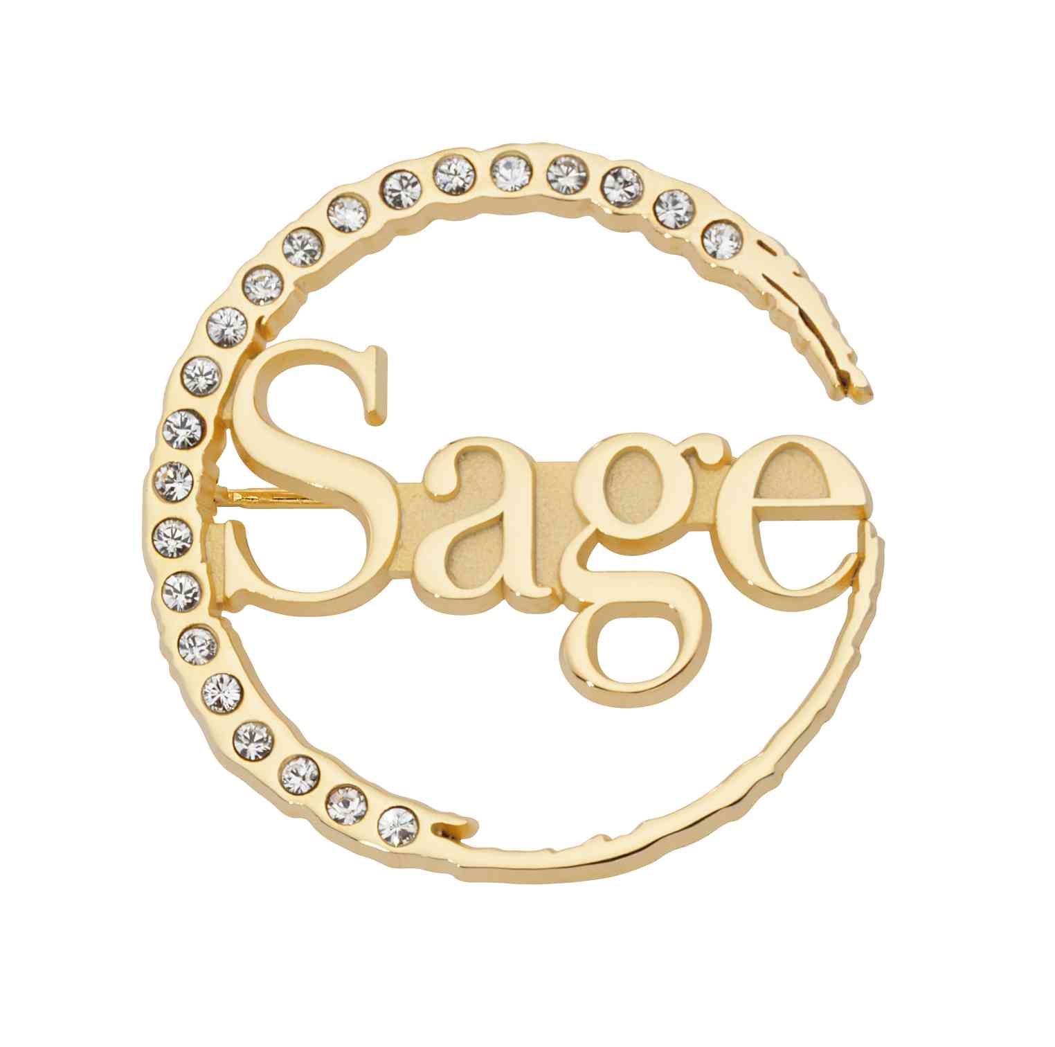 Diamond surround the SAGE logo on this custom gold cut-out brooch pin design with high polish.