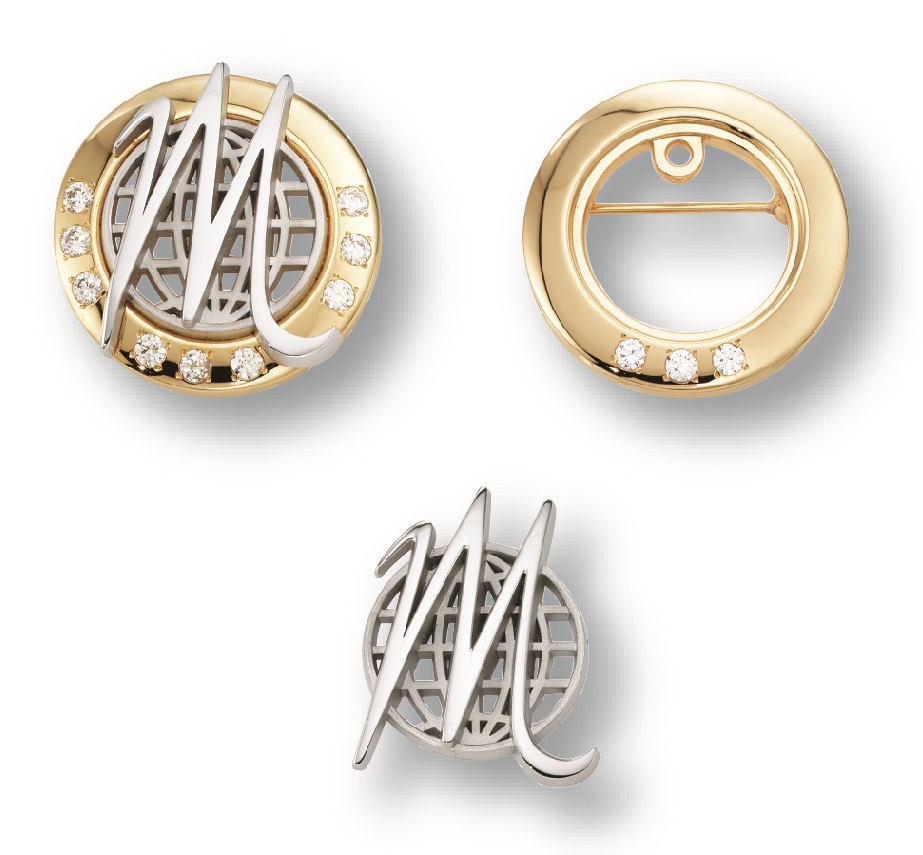 An add-on diamond studded "jacket" creates a new dimension to this custom Mannatech logoed brooch pin design. The gold "jackets" can be interchanged for those with more diamonds as higher achievements are attained.
