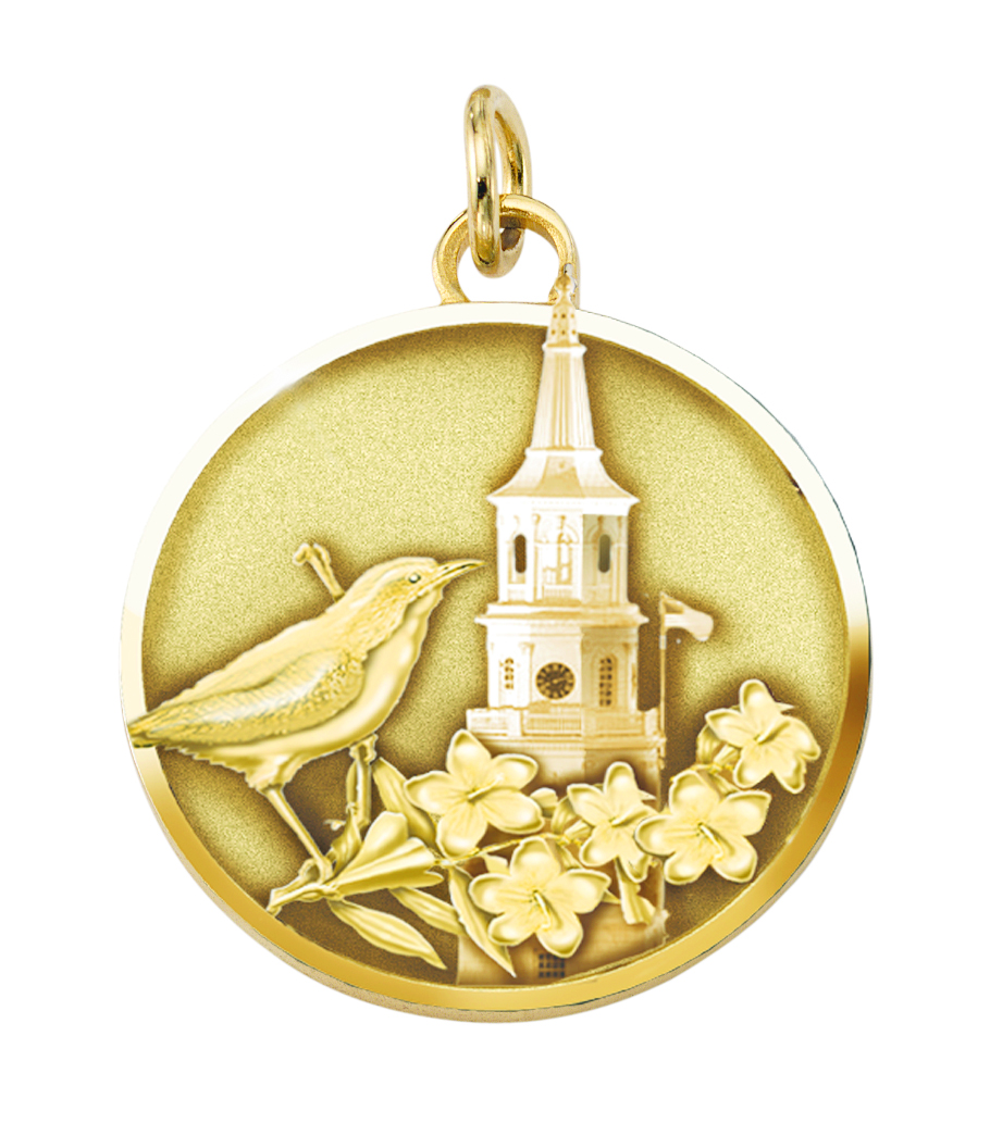 Timeless clocktower spire and southern birds and flowers embody the spirit of the south in this custom gold sandblast and polished gold trip charm. This charm includes a custom message on the back with details of the trip and dates.