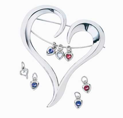 Custom tiny heart charms with multicolored stones dot this stunning modern custom heart shaped brooch charm holder pin. Heart charms are earned as various company goals are met.