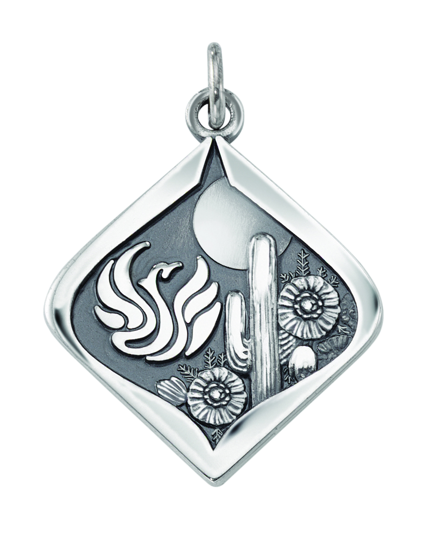 This custom silver trip charm features images of the phoenix rising from the ashes and desert surroundings. Event details and dates are engraved on the back.