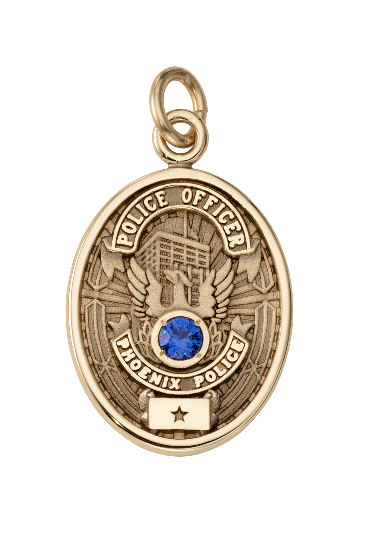 The City of Phoenix police officer shield is detailed on this custom gold antique finished charm which also includes a blue stone set sapphire and a star panel which recognizes years of service with the police department.
