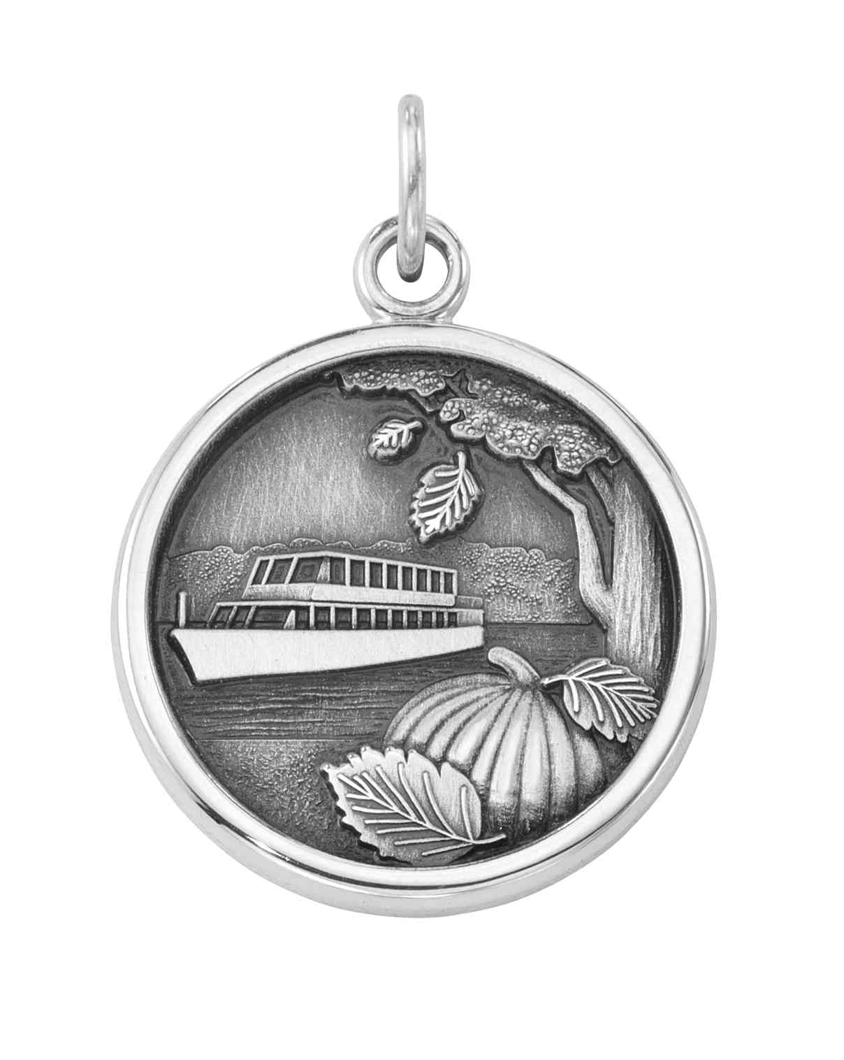 The signs of fall adorn this custom sterling silver river cruise trip charm, with leaves falling and pumpkins ripening.Event details and dates are engraved on the back.