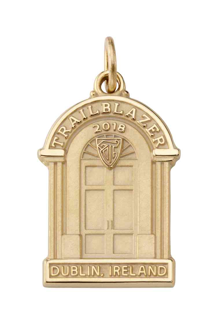 The unique arched doors of Dublin are modeled in this timeless custom gold Trailblazer trip charm.With trip details and dates on the back, it is a truly one-of-a-kind keepsake.