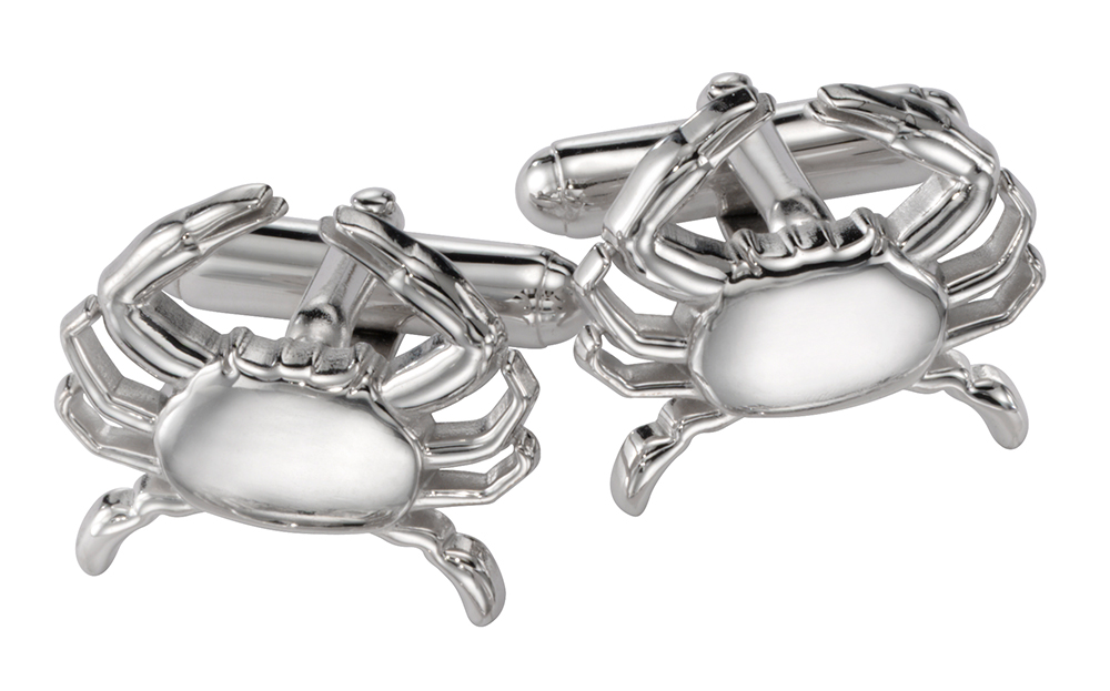 These custom sterling silver modeled blue crabs were used as promotional gifts by the City of Baltimore Chamber of Commerce. The crab was one of several iconic symbols made into pins, charms and cufflinks.