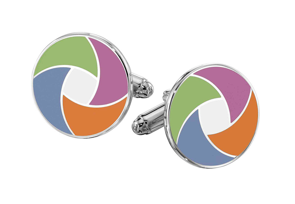 This swirled logo really pops with color on these custom silver cufflinks. A great employee recognition award or client gift.