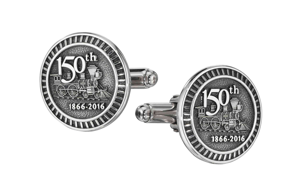 A classic steam engine is modeled into these classic looking custom silver antiqued 150th anniversary cufflinks. A great gift to commemorate the corporate milestone.