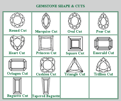 Generally, there are seven principle diamond shapes for jewelry: Round, Marquise, Emerald, Princess, Pear, Oval and Heart. Side stone options include these seven shapes as well as Baguette and Trillion. The most popular shapes of diamonds are:
