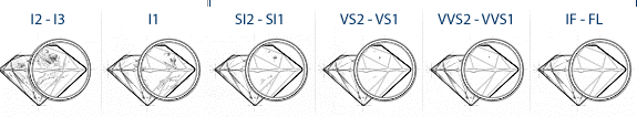 Clarity refers to the presence of flaws on the surface of the diamond or inside the diamond. The flaws inside the diamond are referred to as "Inclusions"; those on the surface are referred to as "Blemishes". The degree to which these flaws are present in a diamond affects the clarity grading of the gem. Clarity grading ranges from Flawless (completely free of flaws) to Included 3 (diamond with large, heavy blemishes and inclusions which are visible to the eye).