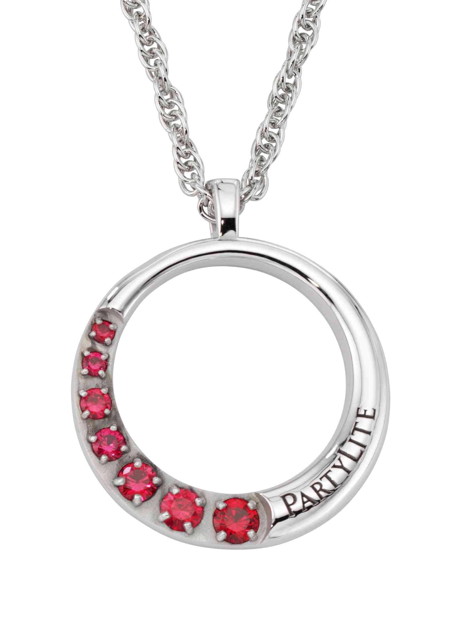Red stones create a stylish arc on this circular high polished custom sterling silver necklace pendant for PartyLite. A beautiful award recognition piece for their consultants.
