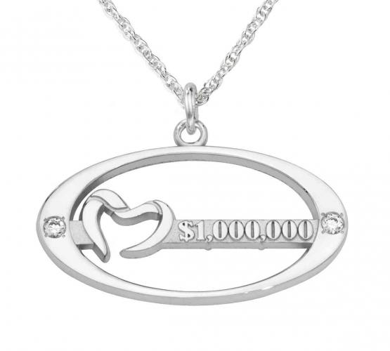 The Pure Romance heart logo sits next to the sales award level on this custom high polished silver necklace pendant with two stone set diamonds.A modern and elegant sales award piece.