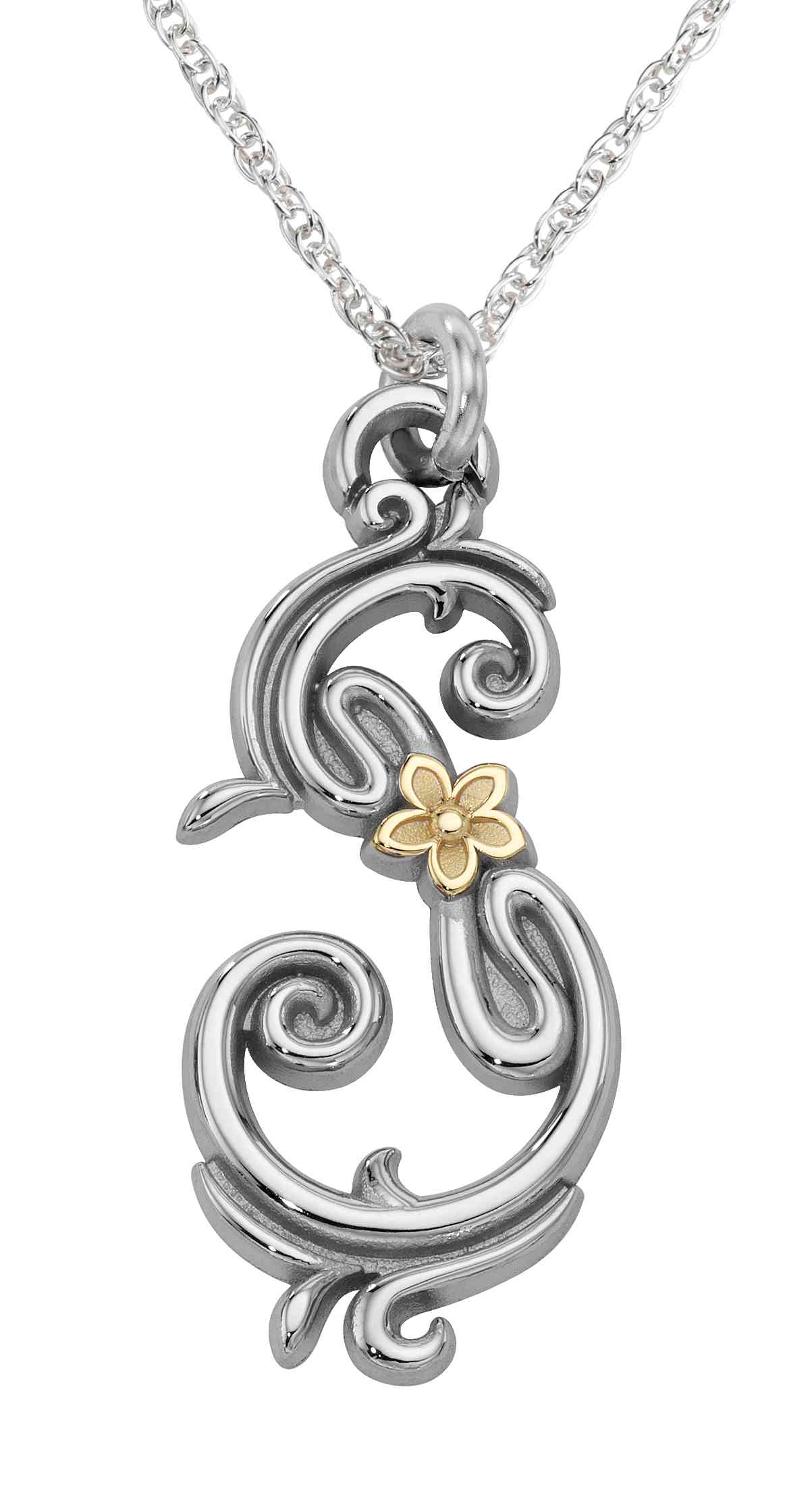 This timelessly elegant custom sterling two-tone necklace pendant incorporates golden flowers and delicate scrollwork for a unique and beautiful piece.