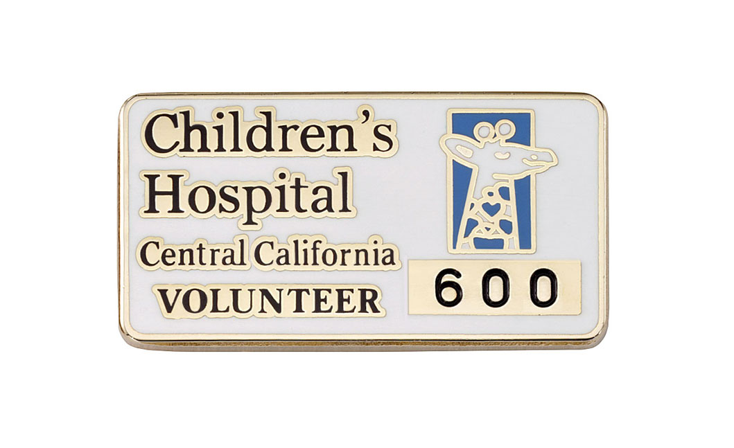 This volunteer appreciation pin features the Central California Children's Hospital logo against a white background. Below it is the recipient's number of volunteer hours.