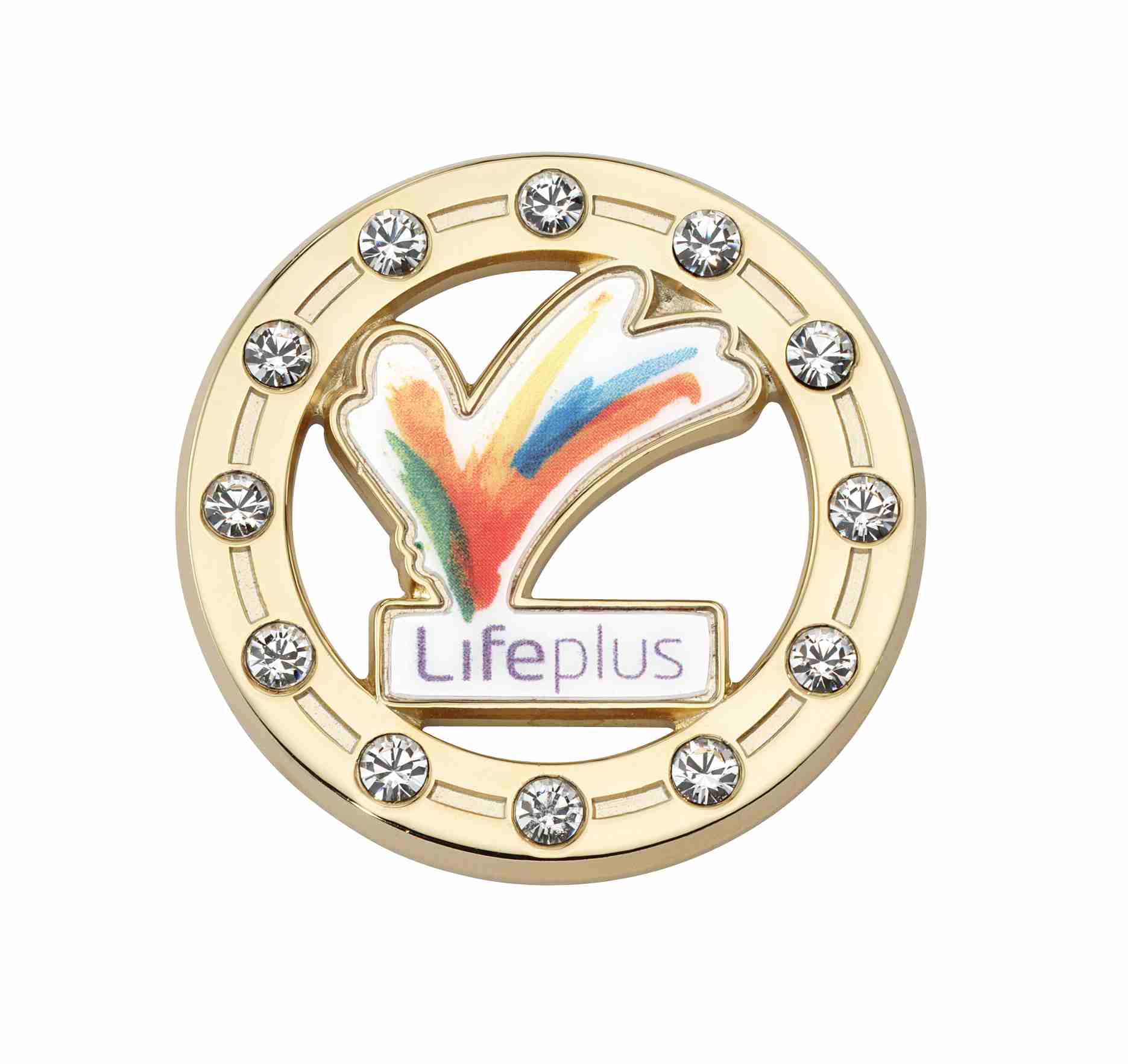 This custom performance award pin for Lifeplus features their logo directly printed on the metal. Surrounding it is a ring of celebratory diamonds.