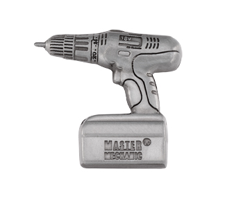 This pin is an impeccably detailed mini power drill with the company's logo on it. A charming way to show off a signature product.