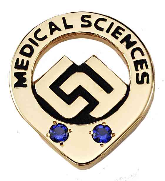 The Medical Sciences logo shines in the center of this length of service pin. Symbolic sapphires denote the recipient's time with the company.