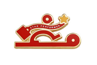 A small red figure offers a yellow star to the recipient of this award pin. The words "Star Performer" shine across the figure's arms.