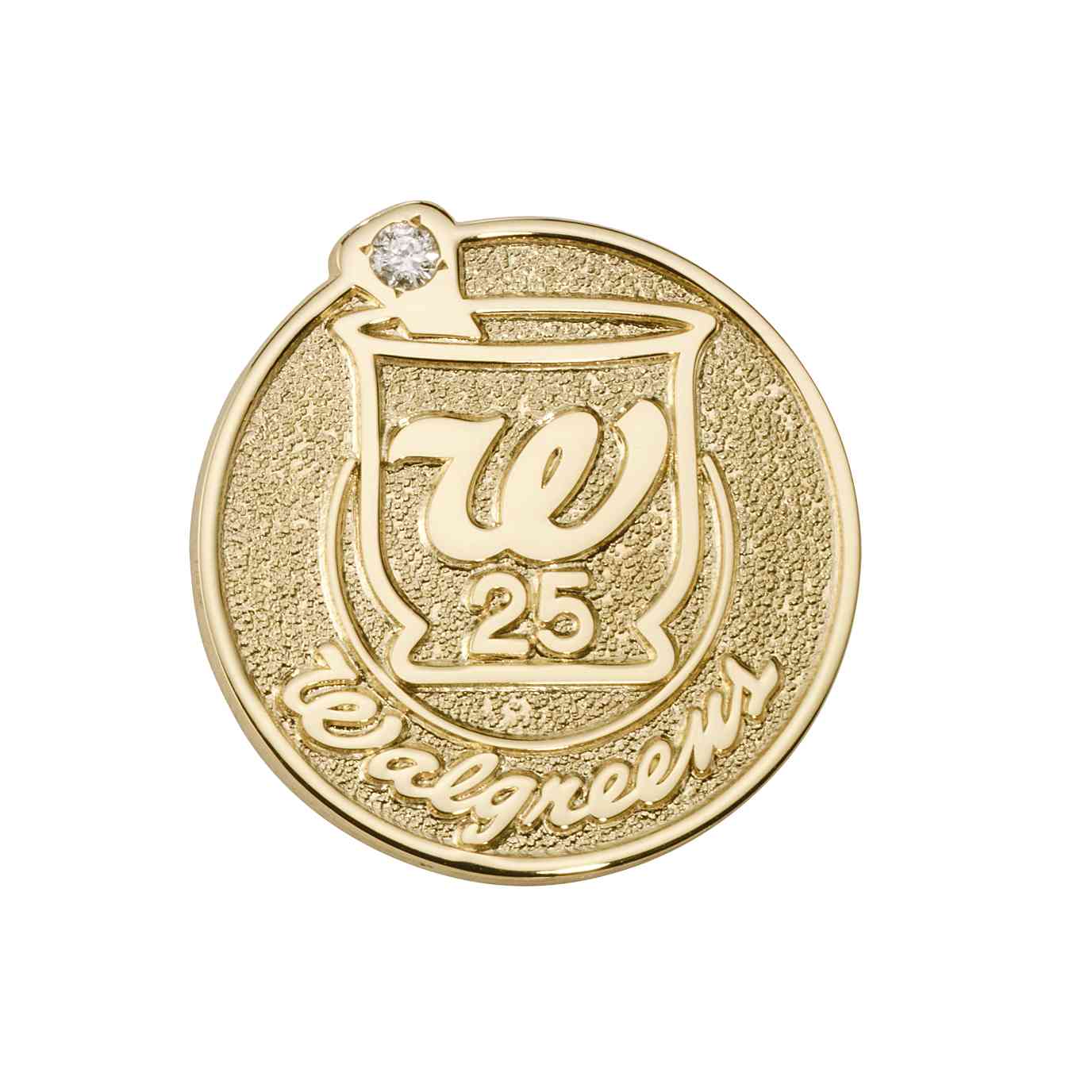 A diamond is incorporated into the Walgreen's mortar and pestle logo for this custom length of service pin. The logo and year number are polished and stand out against a sand-blasted background.