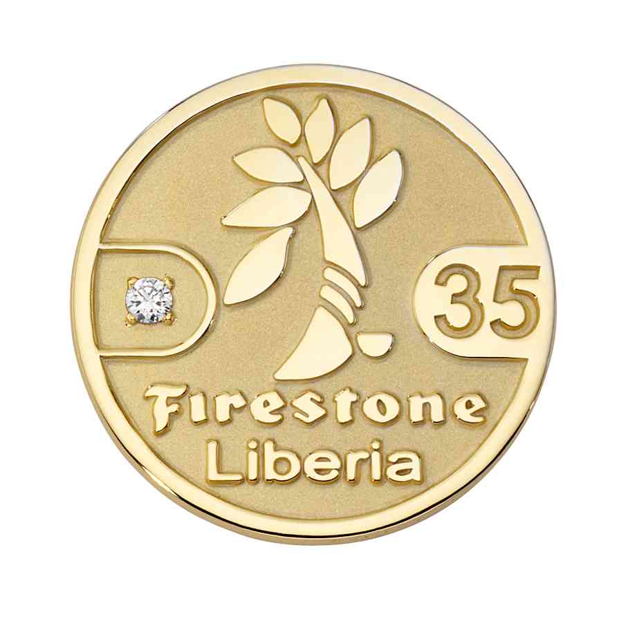 Firestone Liberia recognized their employees' lengths of service by awarding them with this custom award pin. Their rubber tree logo is at the center, with a diamond on one side, and the years of service on the other.