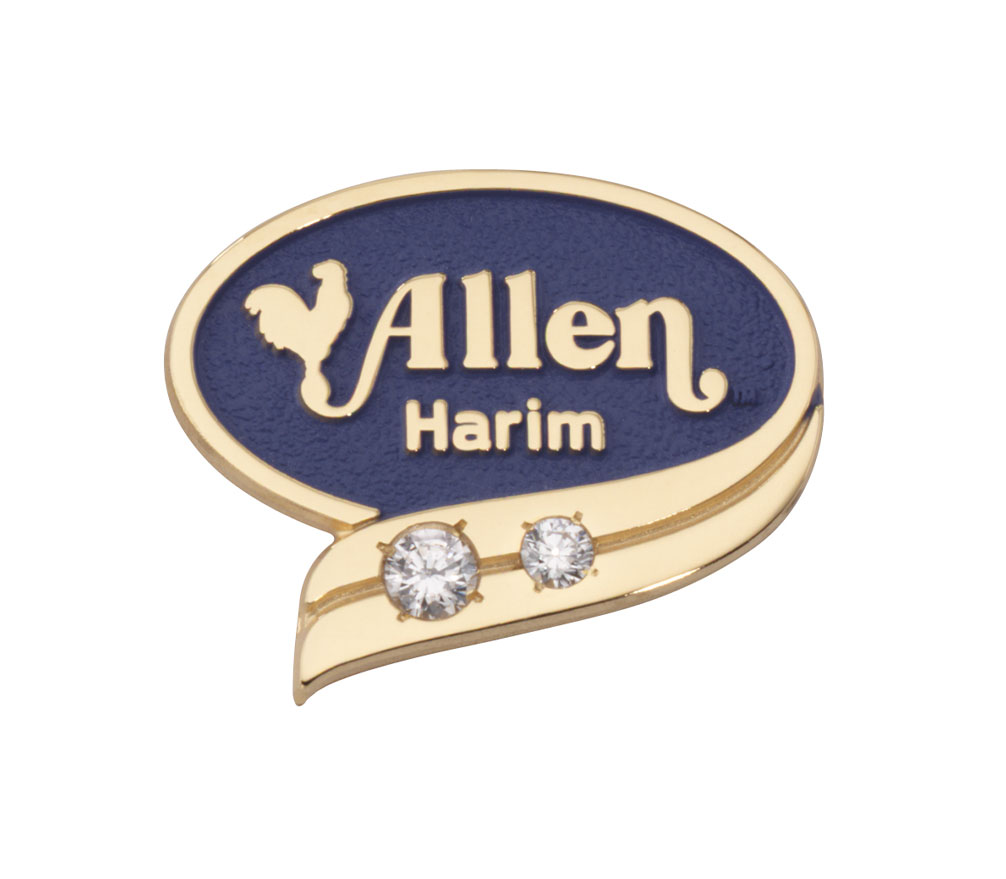 Allen Harim thanked its employees for their loyal years of service with these custom award pins. Their logo appears in polished metal against a blue color-fill background. A wrap-around customizable ribbon holds symbolic diamonds that represent the number of years the employee has been with the company.