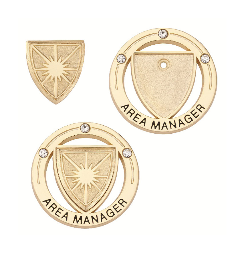 MWR Life recognized its employees' career paths with a series of pins and jackets. The pin consists of their crest-shaped logo, and the jacket makes a ring around it. The pin or jacket can be changed as the employee achieves new goals.