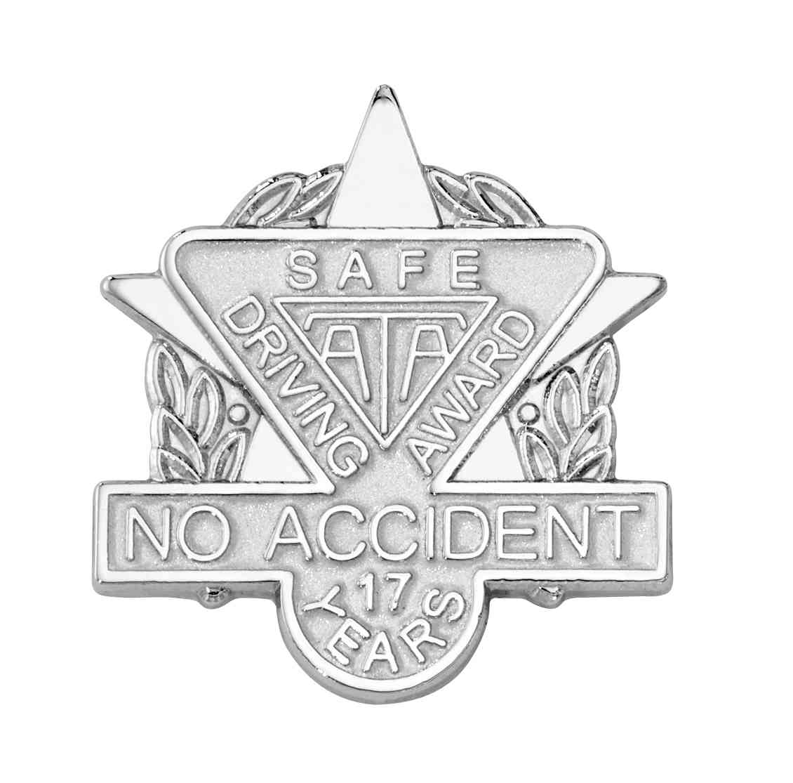 This safe driving award pin incorporates laurel wreaths and a star to herald the recipient's achievement. The name of the award is at the top of the pin, while the specific achievement is below.