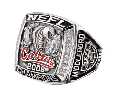 A sterling silver cobra is surrounded by diamond confetti in this spectacular men's championship ring for the Middleboro Cobras.The Cobras' name pops in red, and the NEFL logo is displayed on the side.