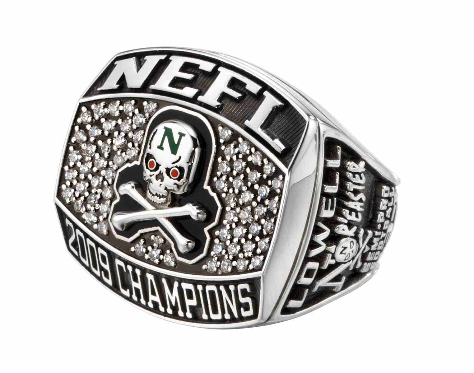 The Lowell Nor'easter's logo has been given red eyes and a green "N" on this striking sterling silver men's championship ring.Diamonds fill the surrounding space, and the team's text logo is displayed on the side.
