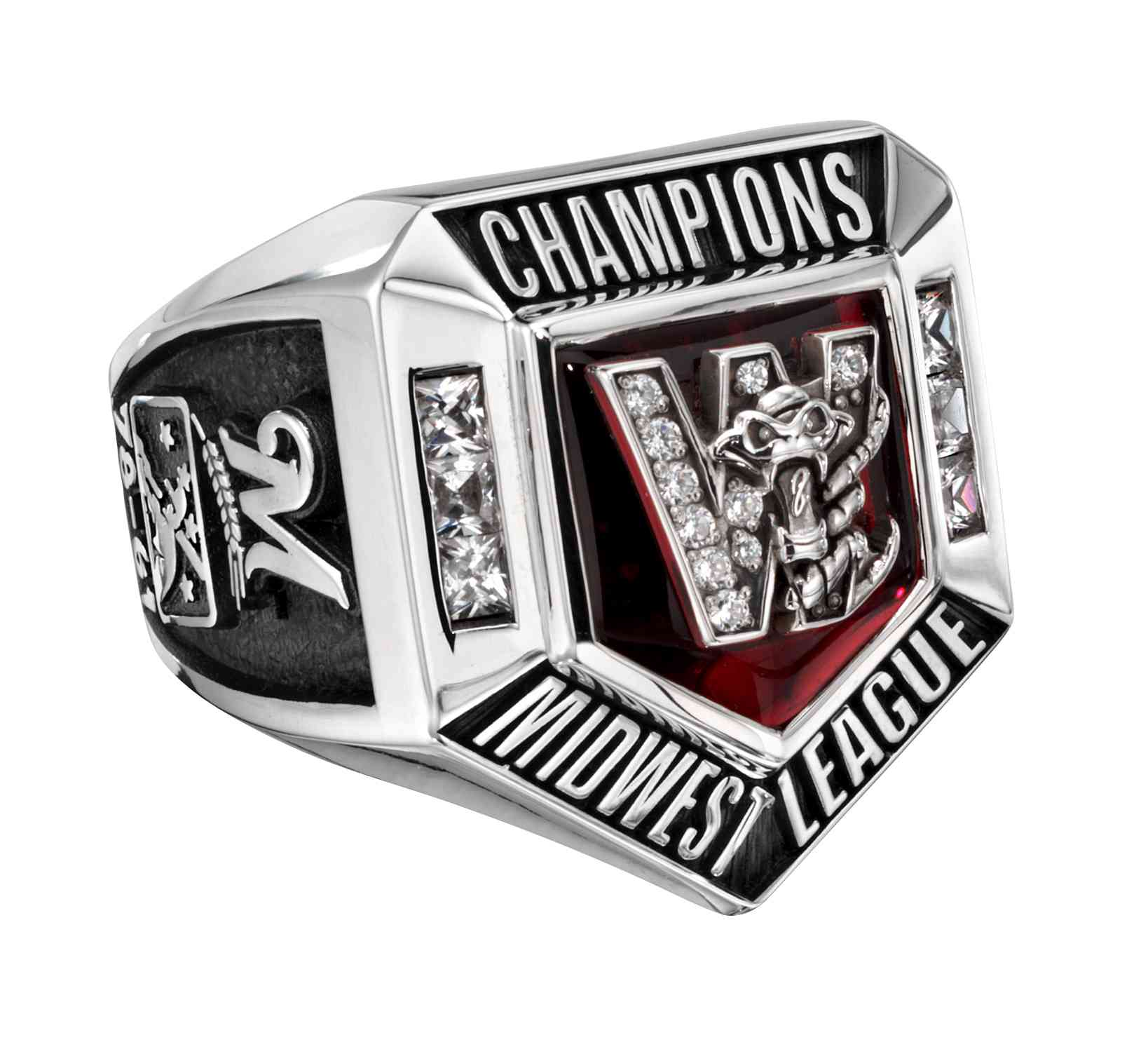 A silver snake slithers through a diamond "W" in the middle of this sterling silver men's championship ring.This modern and sleek design features a ruby center stone, channel-set diamonds, and the Midwest League's logo on the side.