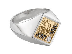 This sterling silver men's signet award ring features a 10 karat gold square. The square is customized with the company's logo and colors in the form of a diamond and dark blue sapphires