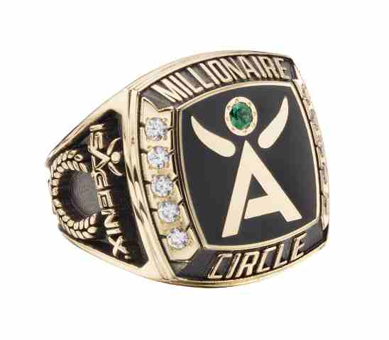 A round cut emerald elevates the Isagenix logo to the next level on this 14 karat gold men's sales award ring. Diamonds separate the text and the full logo is displayed on the side above a laurel wreath.