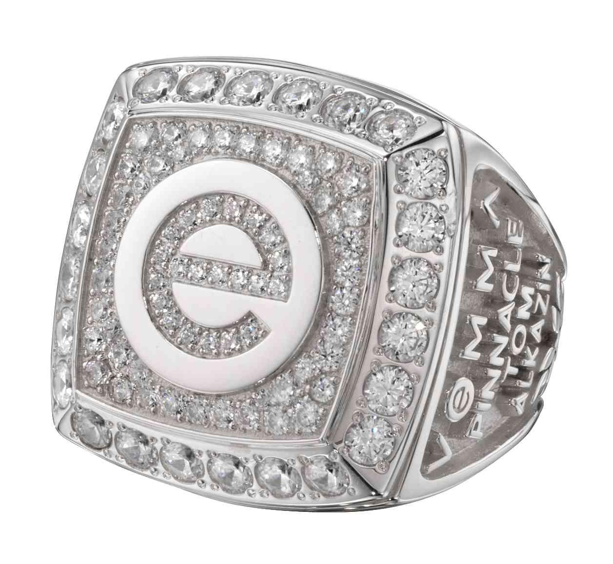 Diamonds fill every possible space around this company's logo in this dazzling white gold men's sales award ring. The side is customized with the company name, achievement level, and the recipient's name over celebratory laurel leaves.