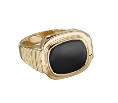 A black onyx center stone is the focus of this 10 karat gold women's award ring. The sides of the ring have a wavy ripple effect.