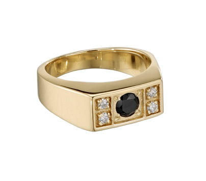 A round cut black onyx center stone is framed by diamonds in a rectangular bezel in this contemporary 14 karat gold women's sales award ring.