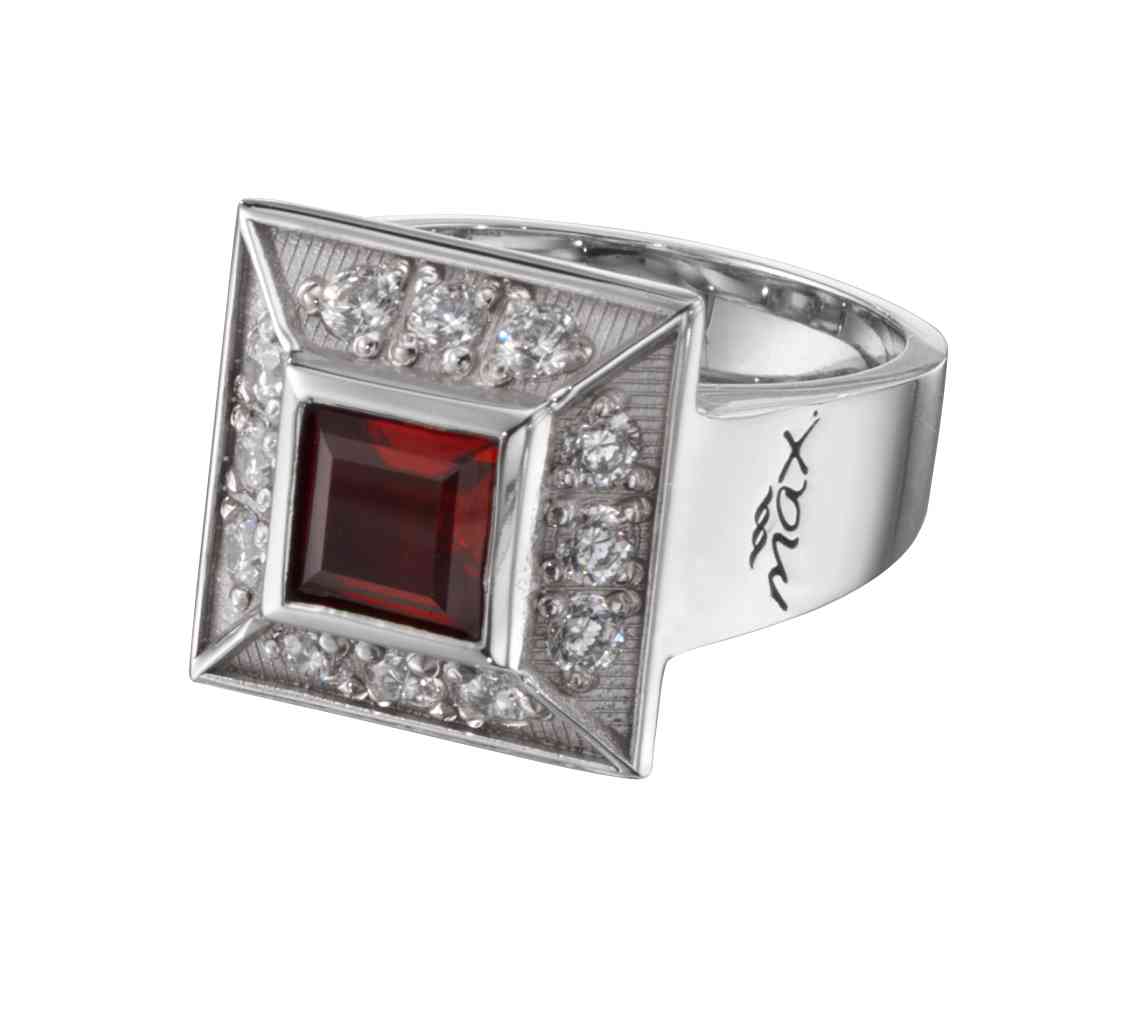 A square ruby is framed by diamonds in this striking 14 karat gold women's award ring.
