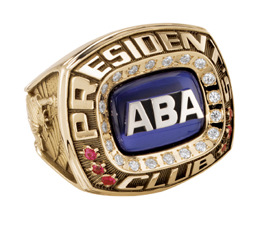 Company initials are fastened to a sapphire center stone and surrounded by diamonds in this stunning 14 karat gold men's sales award ring. Rubies are used to separate the text and the company logo is cast into the side.