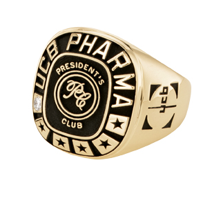 A president's club emblem takes center stage in this 10 karat gold men's sales award ring. Each star represents a place where additional diamonds can be added as the employee reaches higher goals. The company logo is engraved into the side of the ring and colored black.