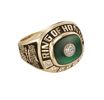 A beautiful round diamond is set inside an emerald center stone in this classic 14 karat gold men's sales award ring. Diamonds underscore the text, and the company logo is proudly displayed on the side.