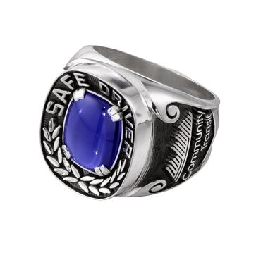A sapphire center stone is framed by laurel leaves in this sterling silver men's safe driver award ring. The company logo is featured on the side against a swirling black background.