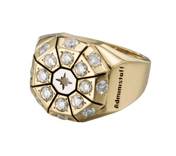 A compass is at the center of this dazzling octagonal design. Diamonds stud the bezel of this 14 karat women's award ring, and the company name is engraved and colored black on the side.