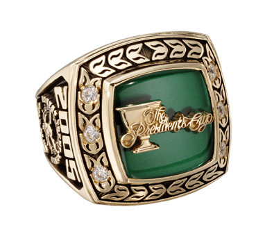 The golfing green is well-represented on this classic championship ring for the President's Cup. Their logo shines in gold across an emerald center stone and is framed by sparkling diamonds in this handsome gold ring.