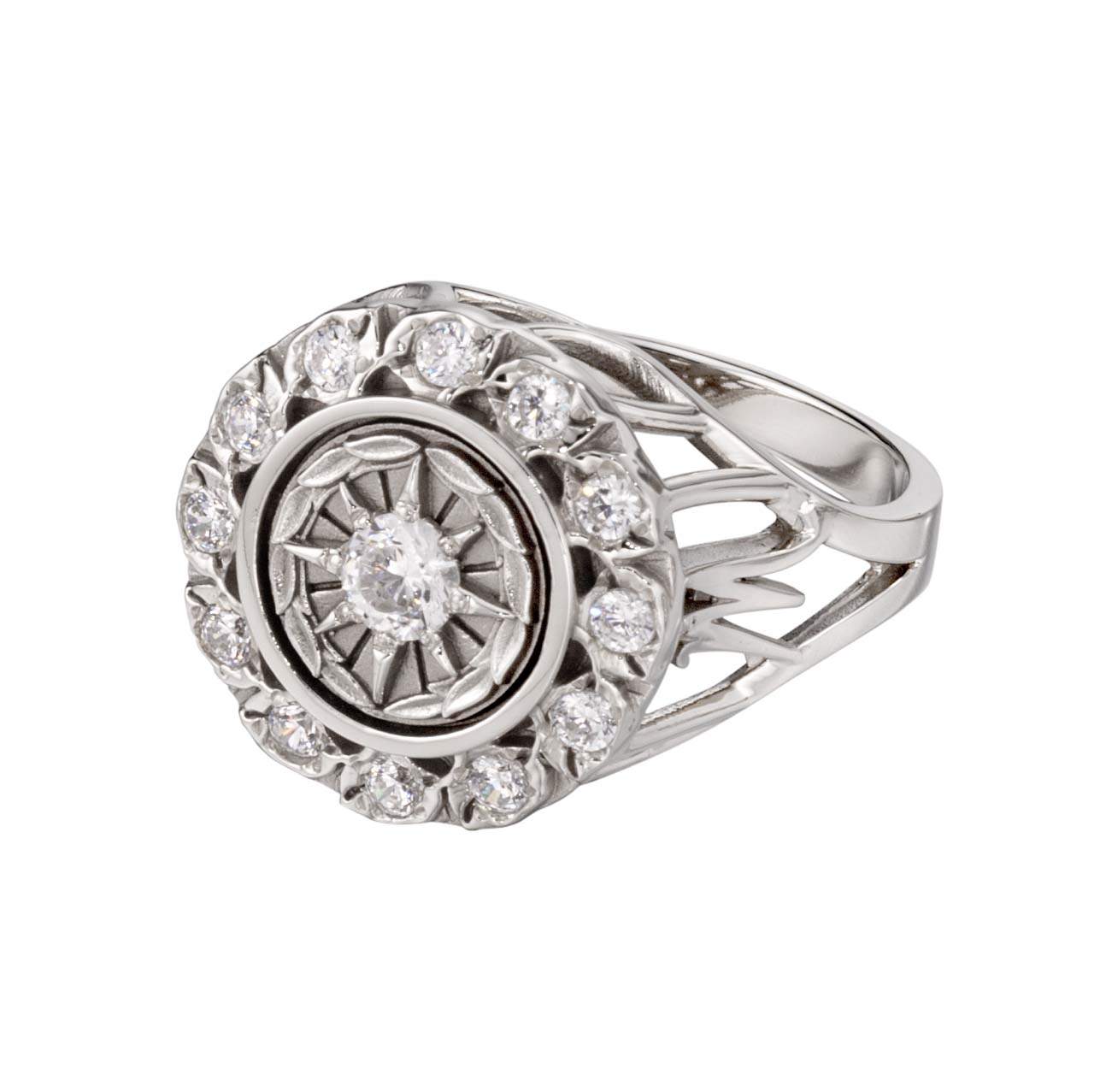 A compass is the sparkling focus of this elegant sterling silver ring. Diamonds frame the logo, while swooping letters complete the ring.