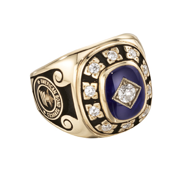 This ring design plays with shapes and swirls to celebrate sales achievement. A sapphire center stone houses a round diamond in a square gold frame. Surrounding it is a black onyx frame studded with diamonds. The logo is proudly displayed and accented with a swirling gold design.