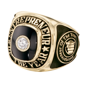 This classic men's award ring features a round cut diamond set inside a black onyx center stone. The achievement is touted on both the top and sides, with the company's logo shining in gold.