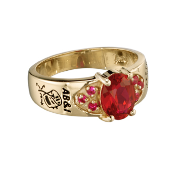 An oval cut ruby framed by smaller round cut rubies adds color and sparkle to this 10 karat gold women's sales award ring.Custom engravings on either side are colored black to stand out against the gold band, and include the company logo.